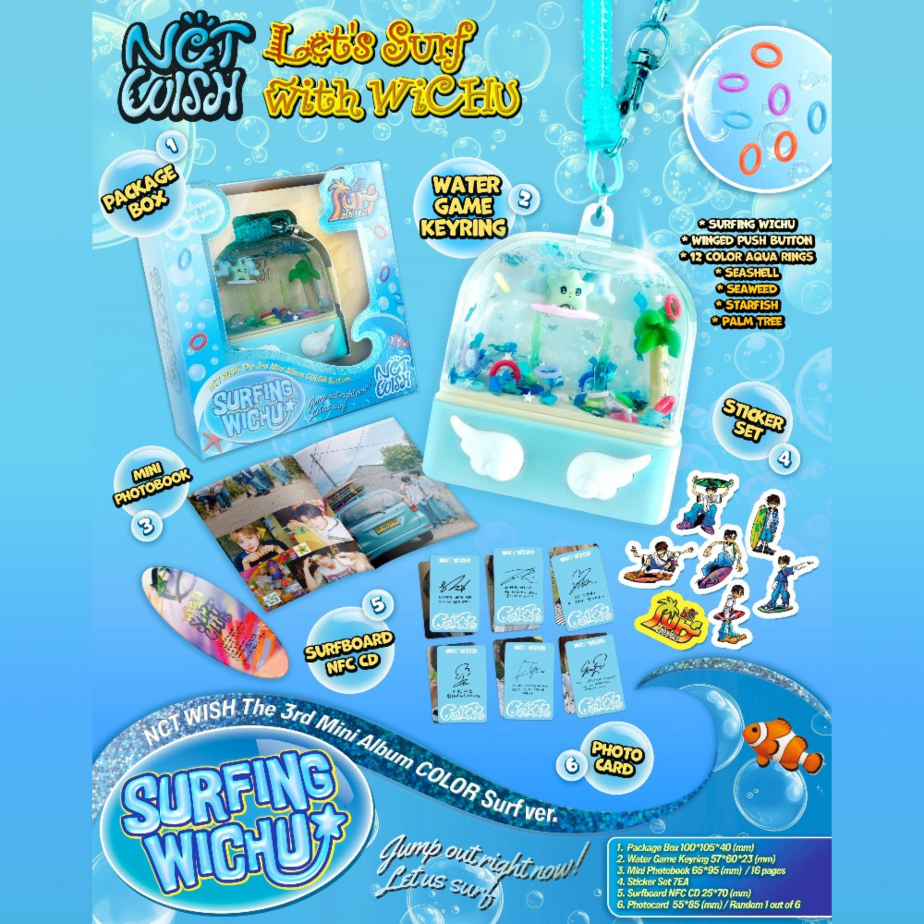 What's in the box- Package box- Water handheld game- Mini photobook 16 pages- Sticker- Photo card- Music NFC card